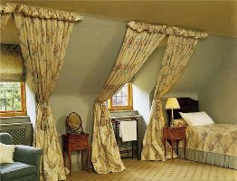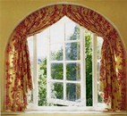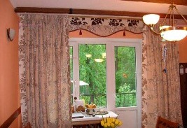 Для тех, кто предпочитает классический стиль в оформлении загородного дома, подойдут готовые шторы, выполненные из эффектных дорогих тканей, с вплетением серебряных и золотых нитей, украшенные красивой вышивкой. Они могут быть разные по форме: мягко обволакивать окна или тяжело ниспадать до самого пола. Изящные кованые карнизы идеально подойдут для таких штор. Не помешают и ламбрикены, которые завершат «одежду» для окон загородного дома. Шторы классического стиля желательно повесить в гостиной загородного дома или в его каминном зале.