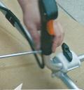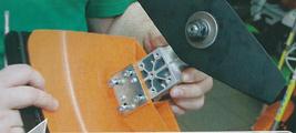 7. Если же предстоит работа режущей леской, то на защитный кожух бензопилы дополнительно надевают пластиковую «юбку» и ставят нож для обрезки лески. У некоторых разновидностей этой модели кожух может быть универсальным или прилагаться два разных кожуха – один для лески и другой для ножа.