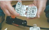 1. Начать сборку надо с того, что открыть коробку и проверить комплектацию агрегата. Если всё на месте, то нам предстоит нацепить рукоятку к штанге с мотором, надеть ремень, прикрепить защитный кожух и режущие элементы.