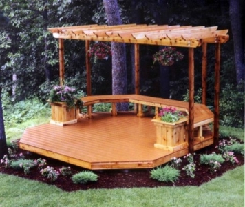 Такой террасный настил в тенистом уголке сада желательно окружить шпалерами с вьющимися растениями, по периметру посадить декоративный кустарник, а на самой площадке поставить удобную скамейку или кресло-качалку.