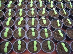 Сажайте семена в горшки не менее 8-10 см в диметре примерно за месяц до высадки на постоянное место. Придвиньте горшки плотно друг к другу и накройте их плёнкой. Оптимальная температура для выращивания рассады – 25-27°. После того как появились первые всходы, плёнку уберите. Поливайте их тёплой водой, и раз в неделю подкармливайте комплексным удобрением. По мере роста рассады, чтобы она не вытягивалась, расставьте горшки пошире. Дневную температуру старайтесь поддерживать на уровне 22°, ночную — 19°. Не забывайте обеспечить рассаде достаточную влажность воздуха.
