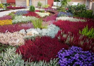 Для коврового цветника правильно будет подобрать травянистые многолетники, такие как тимьян, шиловидные флоксы, хосты, бадан, барвинок, чистец шерстистый, манжетки и пр. Они всё лето не теряют своего декоративного вида. Что касается цветов, то при разбивке сада можно высажать как многолетники, так и однолетние. Среди них упомянем лобелию, бархатцы, декоративную капусту, алиссум, анютины глазки, маргаритки и примулу. Оформляя клумбу, миксбордер или рабатку, цветы не стоит смешивать. Лучше под каждый сорт выделить отдельное пространство. Если на участке устраивают альпийскую горку, то подступы к ней желательно оформить зелёным газоном.