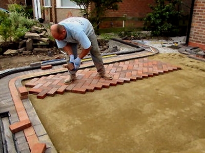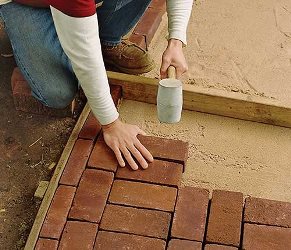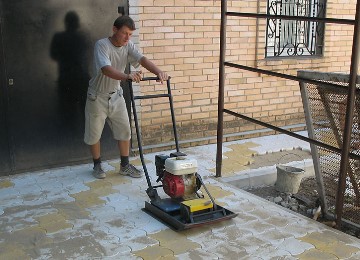 Процесс укладки тротуарной плитки несложен, однако требует определённых навыков. Первая плитка берётся левой рукой, плотно прижимается к основанию и подбивается киянкой до полной неподвижности. При необходимости её можно приподнять и подсыпать под неё немного песка. Следующую плитку выравнивают относительно уровня первой. За этим надо следить до самого конца работы. Между плитками сохраняется промежуток от 2 до 5 мм. Пустые места заполняются разрезаными болгаркой с алмазным диском частями. Когда укладка завершена, готовую дорожку или площадку засыпают песком и втирают его жёсткой щёткой в зазоры между плитками.