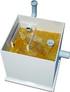 Для домашних нужд эти устройства выпускаются небольших объемов и особого ухода не требуют. Обычно такой помощник на кухне изготавливают из белого пластика или стеклопластика. Он представляет собой бак специальной конструкции с системой перегородок, внутри которых задерживается жир, а очищенная от него вода спокойно стекает в канализацию. В домашних условиях можно установить жироуловитель под мойку прямо на полу. К системе канализации он подводится с помощью специальной трубки, которая находится на выходе емкости.