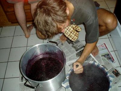 Брожение вина заканчивается, когда опадёт перчатка или из шланга гидрозатвора перестанут идти пузырьки воздуха. Теперь можно аккуратно, через марлю, перелить жидкость в большую кастрюлю, а затем слегка нагреть её на малом огне. Это надо сделать, чтобы выпустить имеющийся в молодом вине газ. Тогда оно будет лучше храниться и не забродит вновь.