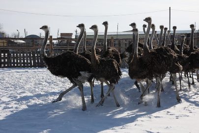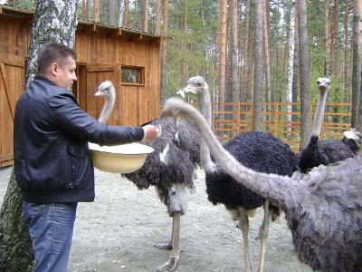 Страус — самая большая птица, живущая на Земле. Вес взрослого африканского страуса достигает 150 кг, а рост 2,6 метра. Овальное туловище самцов покрывают перья чёрного цвета, у самок они серо-коричневые. Оказалось, что страусы могут легко переносить наш климат и даже гулять по снежному покрову. Зимой для содержания молодняка температуры +15 градусов в помещении будет достаточно.