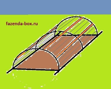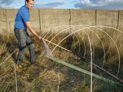 К аркам прикручиваем медной проволокой три тонкие жерди в качестве распорок. Они могут быть составными. Для поддержки плёнки параллельно им натягиваем прочную бечёвку в несколько линий. Обтягиваем каркас теплицы полиэтиленовой плёнкой. Заводим её концы под арматуру и для надёжности подшиваем шпагатом частыми стяжками.