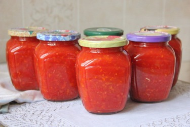 Готовый соус в горячем виде раскладываем по стерилизованным банкам. На данное количество помидоров и моркови понадобится 4 поллитровых.