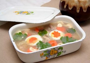 Когда бульон будет готов, вынутое мясо разделываем на кусочки, морковь режем кружочками. Выкладываем их по глубоким тарелкам или другим подходящим ёмкостям. Хорошо добавить в каждую по половинке яйца, разрезанного вдоль. Его желток украсит блюдо. Теперь осталось залить заправку холодца процеженным бульоном и выставить тарелки в прохладное место на ночь. Только не стоит для застывания оставлять холодец на балконе при минусовых температурах. Если замерзнет, то блюдо будет испорчено. Перед тем как подать холодец к столу, желательно снять с его поверхности слой непрозрачного жира.