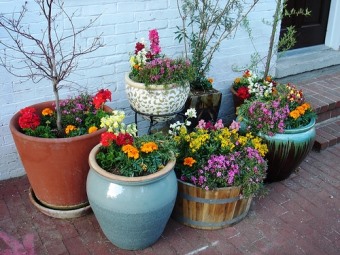 Очень интересно смотрятся клумбы, составленные из растений, посаженных в цветочные горшки, и скомпонованные в небольшие группы. Пространство между горшками засыпается декоративной щепой, галькой, гранитной крошкой или щебнем. Получаются очень оригинальные цветники, в которых практически не растут сорняки. На таких импровизированных клумбочках можно постоянно менять растения, в зависимости от сезона. Например, весной в них выращиваются мускари или тюльпаны, летом петунии и бархатцы, а осенью астры и цинии.