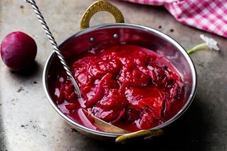 Разбиваем острый перец с чесноком в блендере. Добавляем эту смесь вместе с кориандром, хмели-сунели, сахаром и солью в сливовое пюре. Варим соус, помешивая, ещё 5 минут. Затем разливаем его в горячем виде по стерильным банкам и укупориваем.