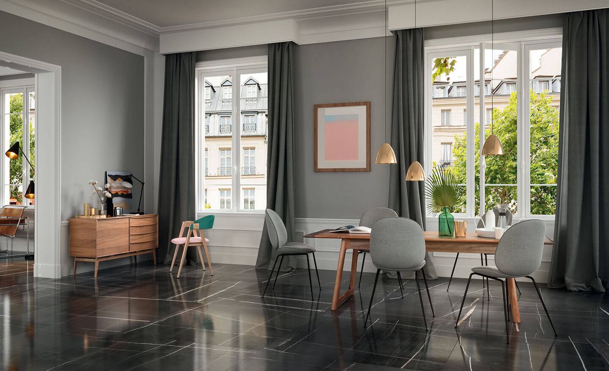 Коллекция испанского керамогранита Nylo Noir имеет полированную поверхность. Плитки крупноформатные, размеры: 150×300 см, 120×250 см, 120×120 см с толщиной равной 6 мм. За счет большого размера керамогранита при укладке создается впечатление, что плиты образуют единую монолитную поверхность.