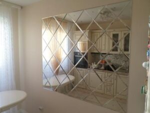 - На стене. Одна из самых распространенных идей – разместить зеркальное панно на стене. Это может быть как отдельное зеркало, так и композиция нескольких маленьких зеркал, которые в сочетании создают интересный узор на стене. Такое зеркало можно разместить как в гостиной, так и в коридоре, прихожей или в другой зоне жилого или рабочего помещения.